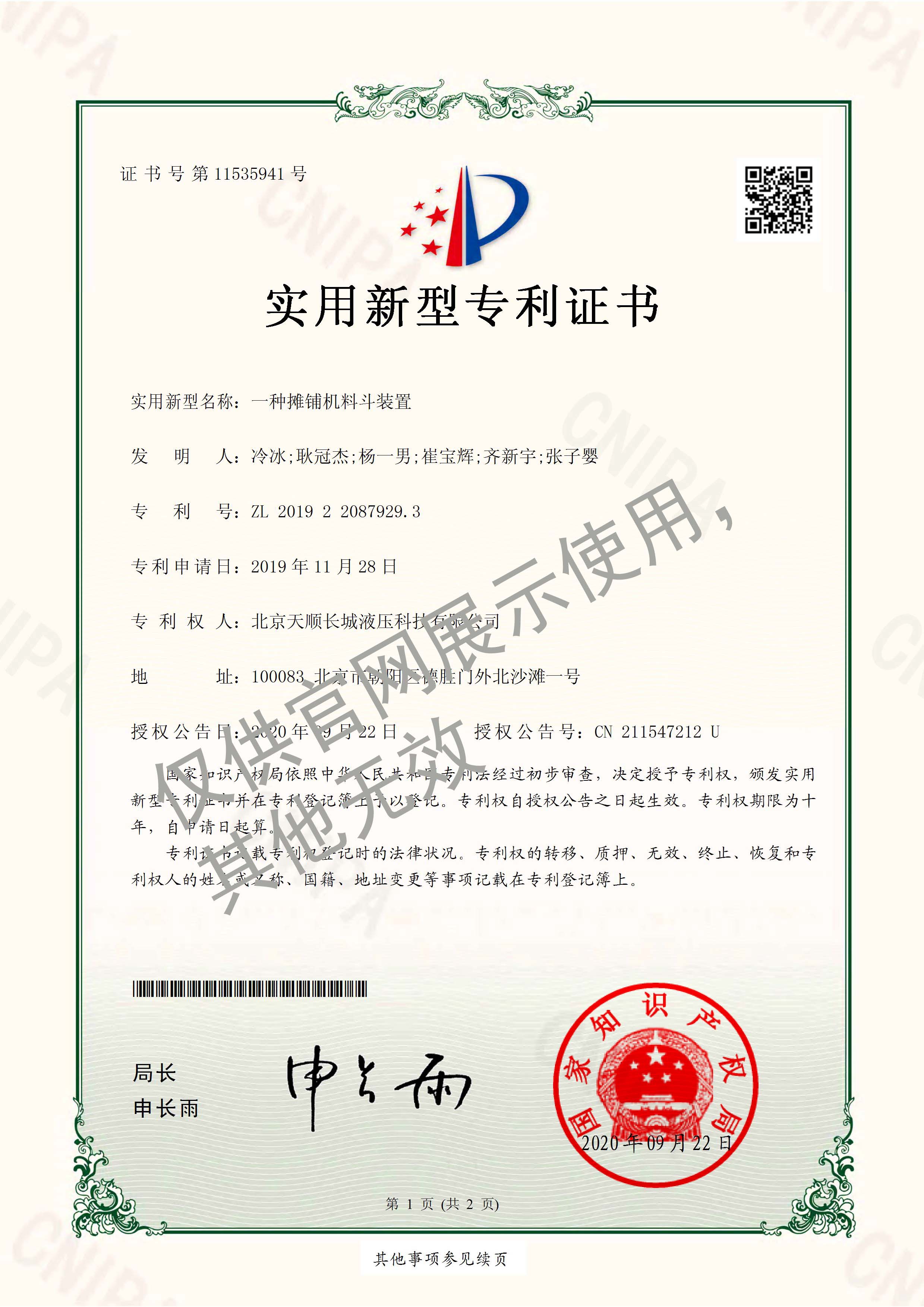 43-ZL201922087929.3實(shí)用新型專利-一種攤鋪機(jī)料斗裝置2019.11.28