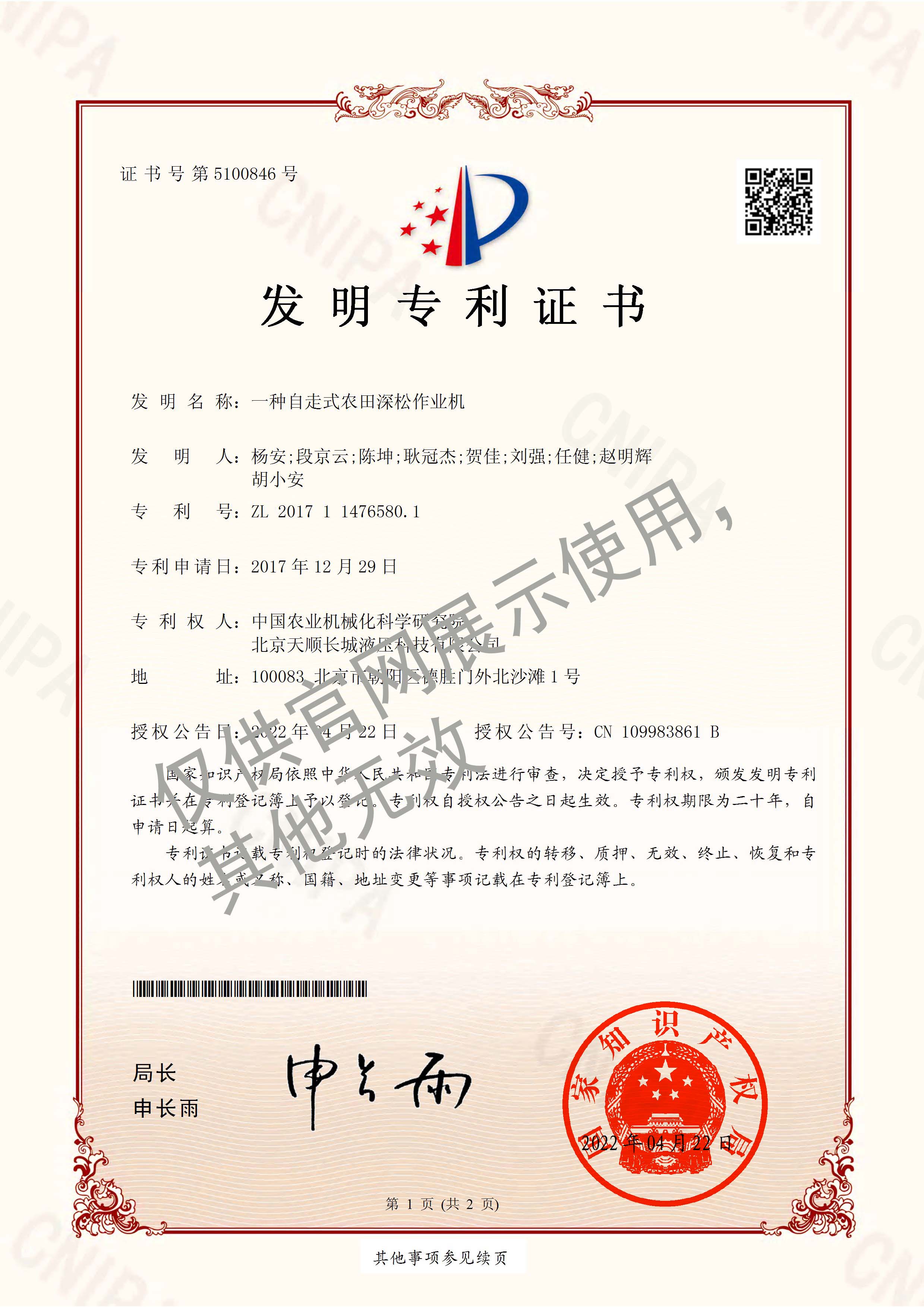 84-ZL201711476580.1-發(fā)明專利證書(shū)-一種自走式農(nóng)田深松作業(yè)機(jī)