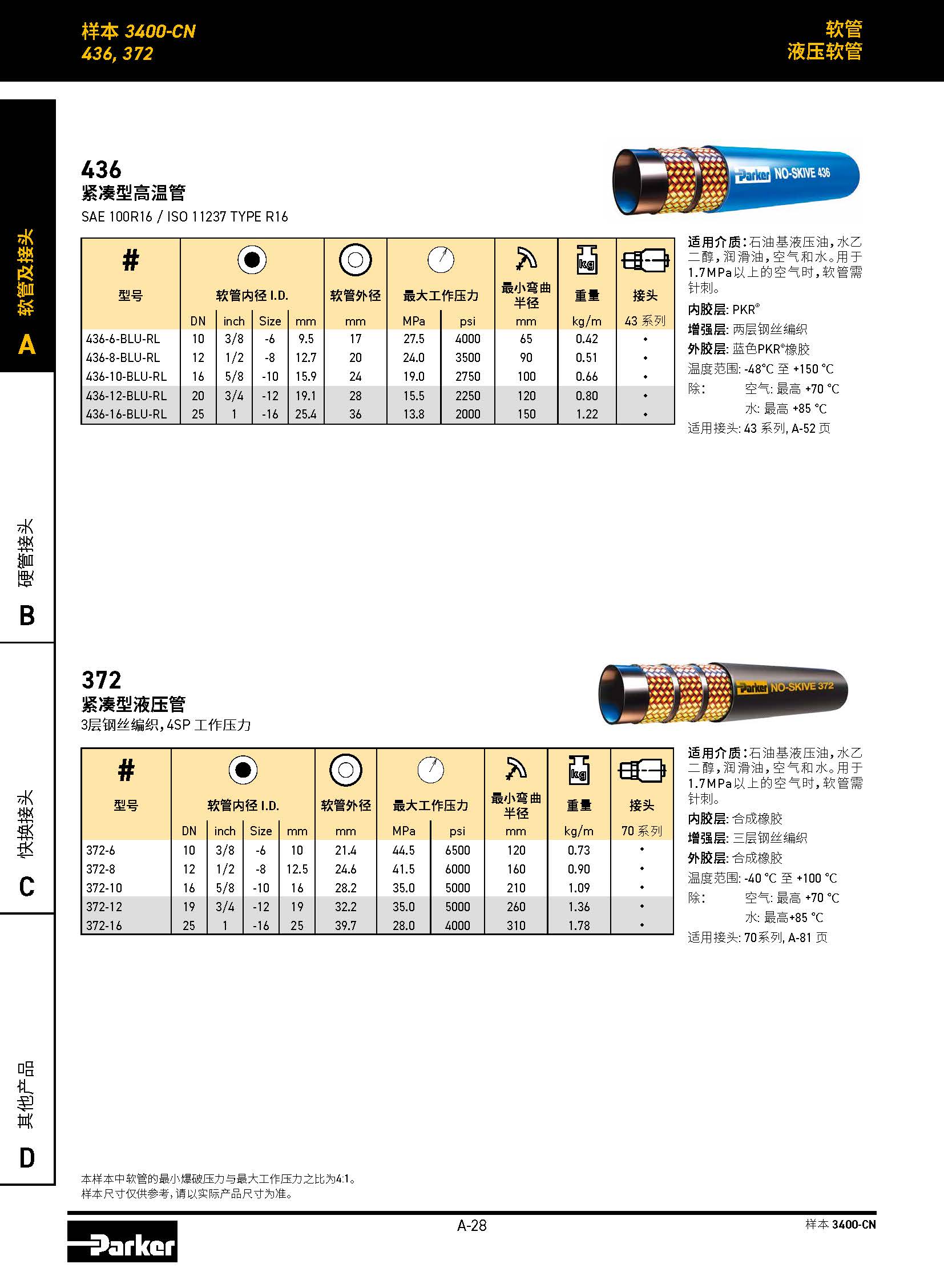 適用介質(zhì):石油基液壓油,水乙二醇,潤滑油,空氣和水。用于1.7MPa以上的空氣時(shí),軟管需針刺。
