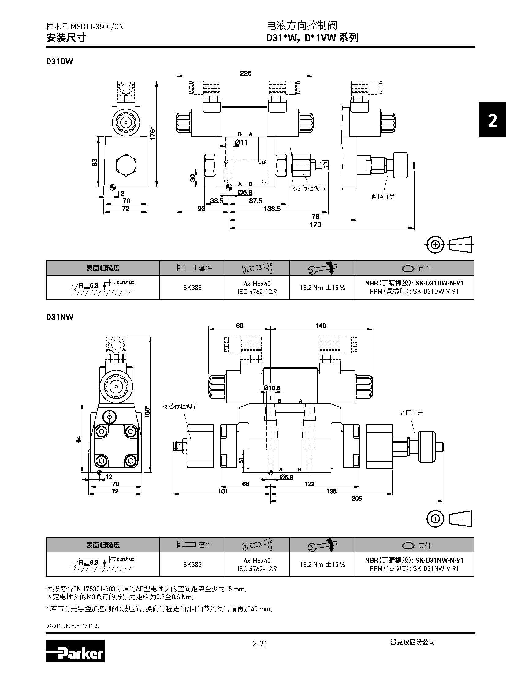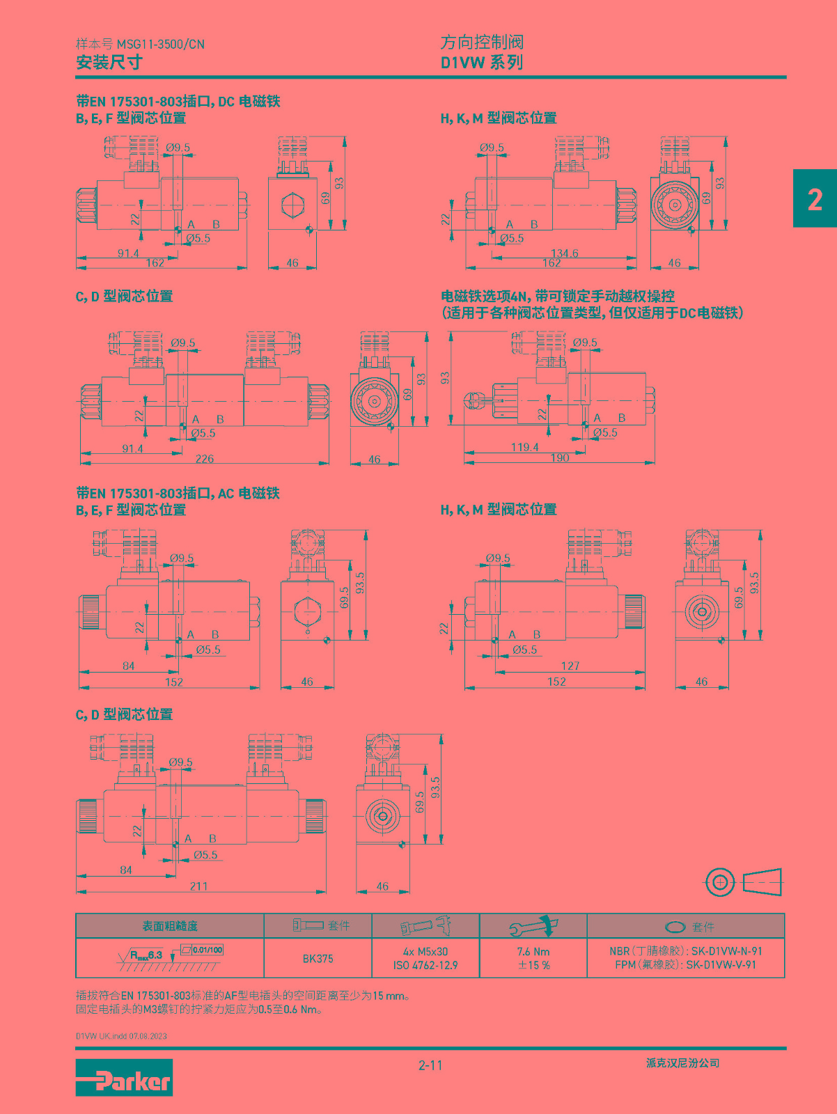 D1MW系列方向閥是基于標(biāo)準(zhǔn)D1VW系列的NG06規(guī)格滑閥 型電磁方向控制閥,但其閥體、電磁線圈及銜鐵管均具有 防腐蝕功能,且其電氣接口界面還具有典型的工程機(jī)械市 場(chǎng)所采用的防蝕接插件,如:AMP Junior Timer 及 DT04 2P “Deutsch”。