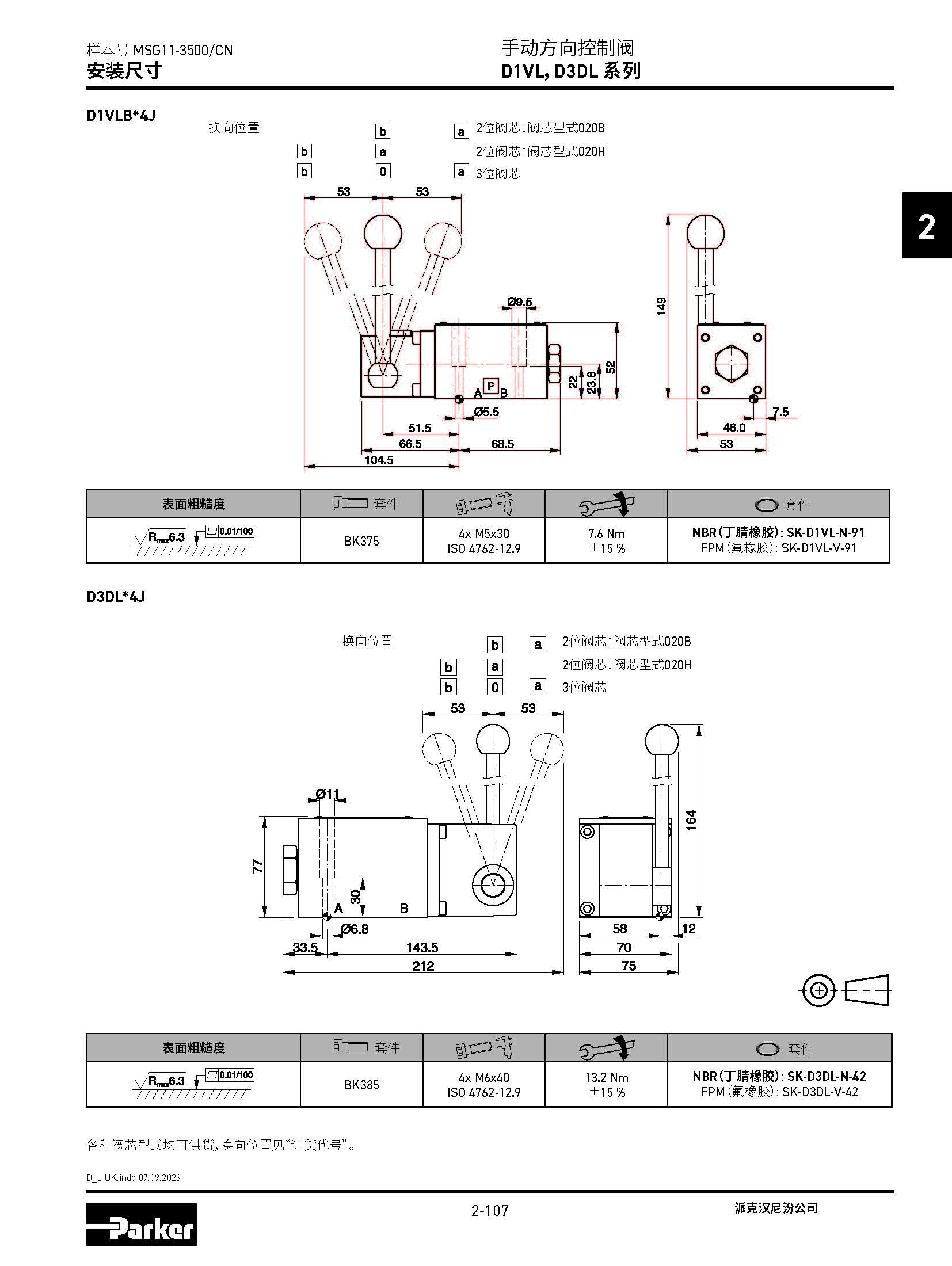 D1VL,D3DL,D4L,D9L系列4/3(三位四通)或4/2(二位四通) 手動(dòng)滑閥式方向控制閥采用與閥芯直接連接的手柄直動(dòng)操 控,其中D1VL系列為3油腔結(jié)構(gòu),而D3DL,D4L及D9L系列則 均為5油腔結(jié)構(gòu)。