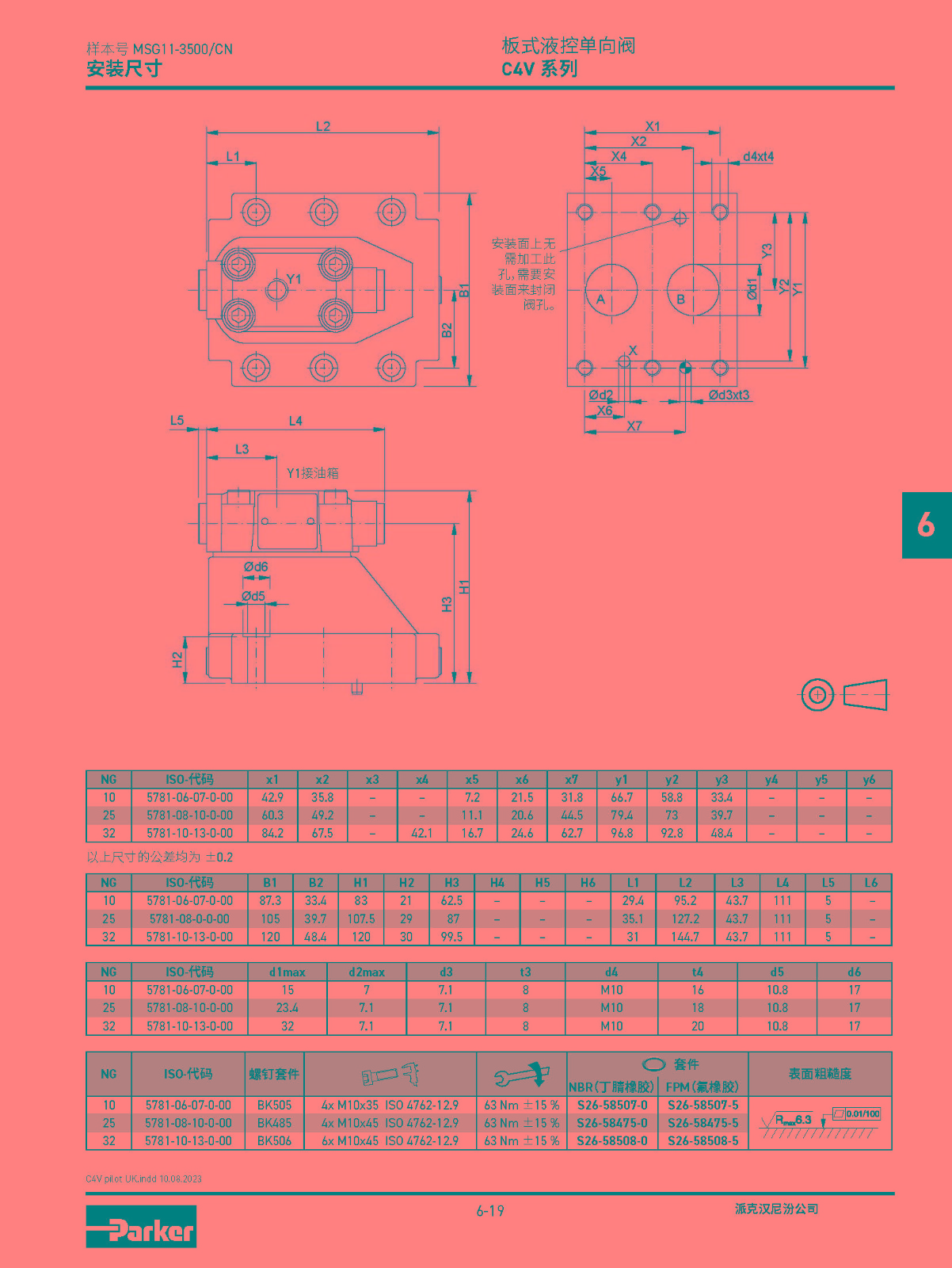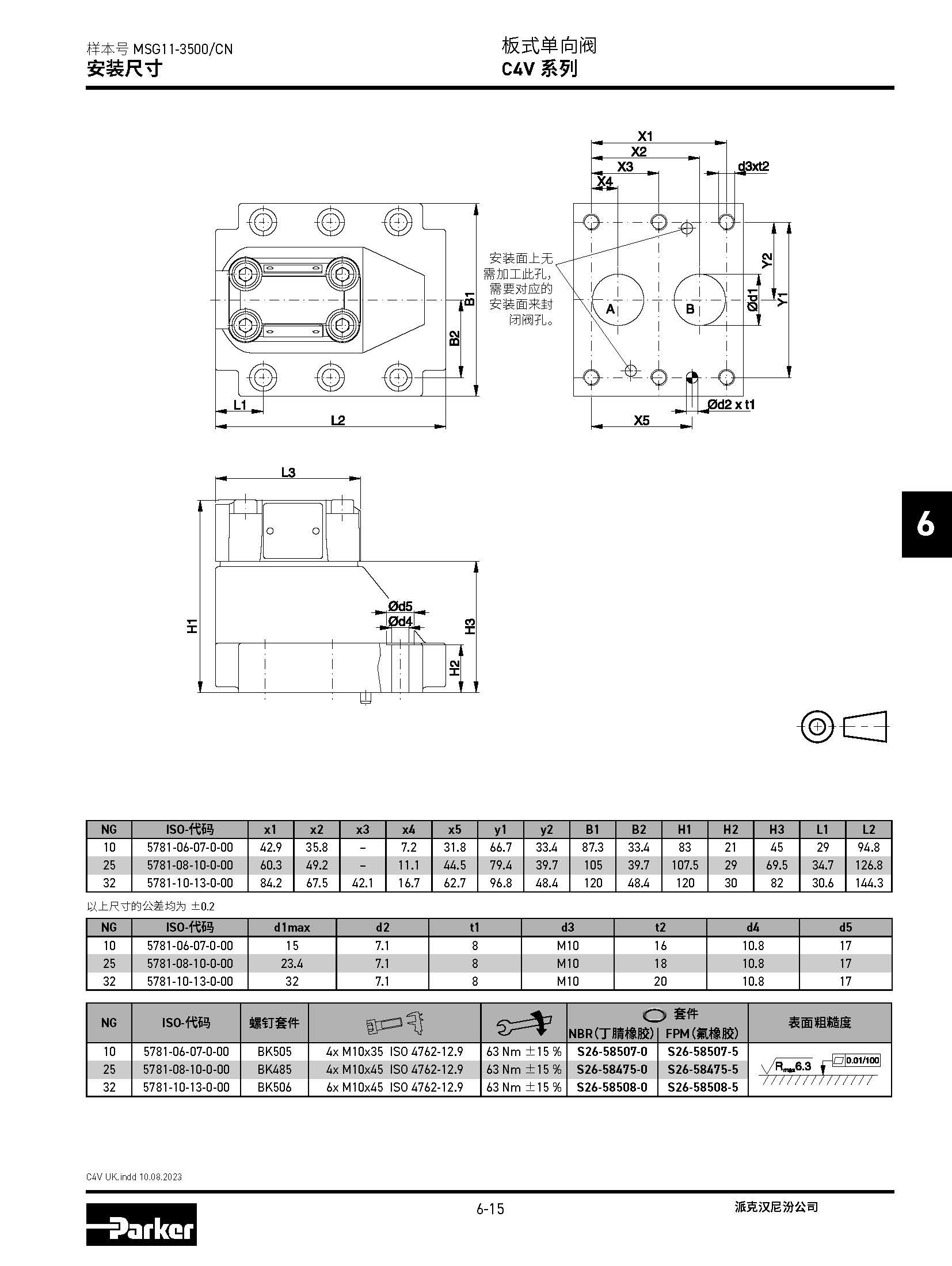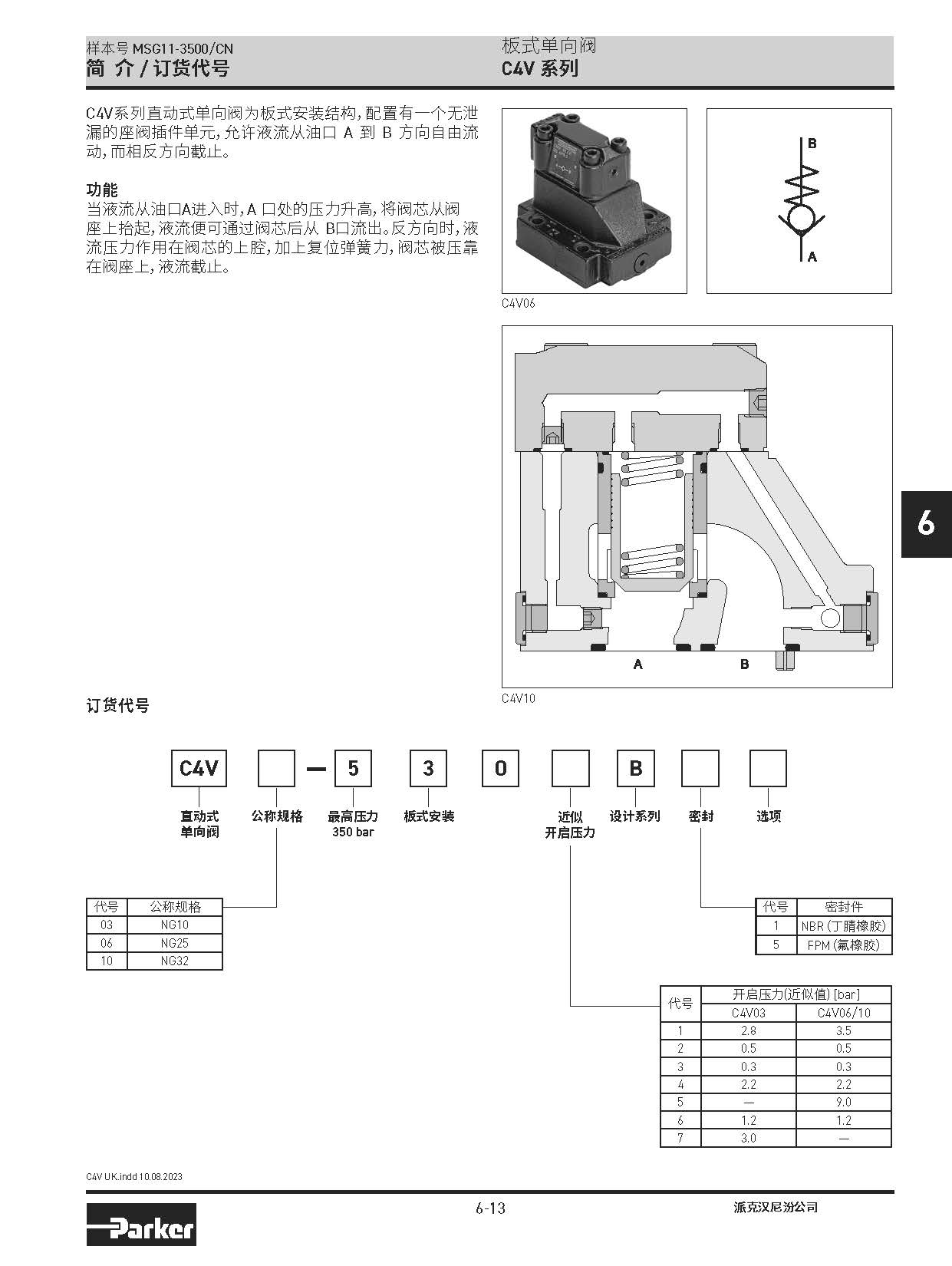 C4V系列直動式單向閥為板式安裝結構,配置有一個無泄 漏的座閥插件單元,允許液流從油口 A 到 B 方向自由流 動,而相反方向截止。